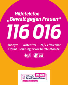 Das Hilfetelefon „Gewalt gegen Frauen“ ist ein bundesweites Beratungsangebot für Frauen, die Gewalt erlebt haben oder noch erleben. Unter der Nummer 116 016 und via Online-Beratung werden Betroffene aller Nationalitäten, mit und ohne Behinderung unterstützt– 365 Tage im Jahr, rund um die Uhr.