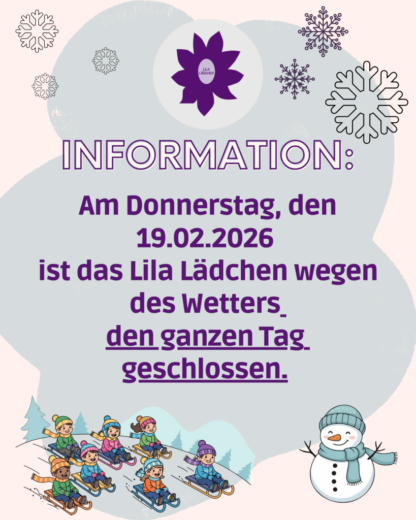• Das Lila Lädchen bleibt am 19.02. wegen Schneefalls geschlossen